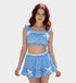 Coordinado en diseño a cuadros celestes y blancos con detalles de pequeños moños. Cute pero sexy a la vez.