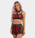 Coordinado estilo colegiala a cuadros rojos con collar tipo corbata y detalles de red a los lados de la falda.