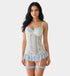 Baby doll de encaje blanco con detalles de celeste y pequeños moños del mismo color.