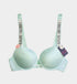 Brassier estilo media copa, satinado, con poco push-up y con detalles de pedrería (imitación de cristales) en los tirantes, en un nuevo colorido.