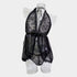 Coordinado tipo vestido de mesh con detalles de encaje, estilo halter, espalda escotada.