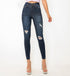 Skinny jeans de tiro alto, con pequeños detalles de rasgado que le darán un toque diferente a los outfits que hagas con estos pantalones.
